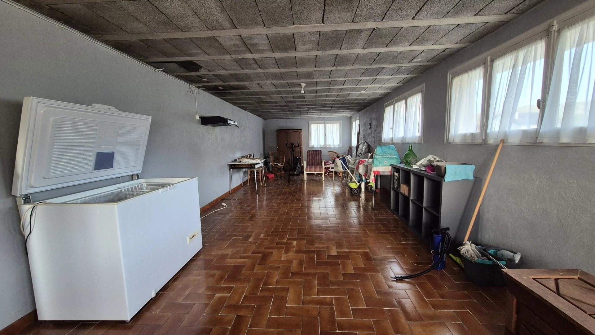 Cette maison traditionnelle du milieu des années 60 dispose de la vie à l'étage. Elle dispose de deux garages de 30 m² chacun, ainsi que d'une grande pièce de 47 m² pouvant servir d'atelier, de pièce pour recevoir, faire des repas ou tout simplement en faire une pièce d'habitation.